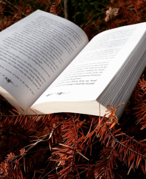 I may re-do this photoshoot altogether. I did like the colours of the props and everything, but the poor lighting just ruined it all. The next photoshoot took place this past weekend while I was in Muskoka (Northern Ontario, Canada). And couldn’t resist taking pictures of the one book I’d brought with me, Siege and Storm. I found a red pine tree, and while I wasn’t sure whether it was dead or dying, or if it simply changes colours in the Fall, I did know that I just had to take a picture of my book with them.