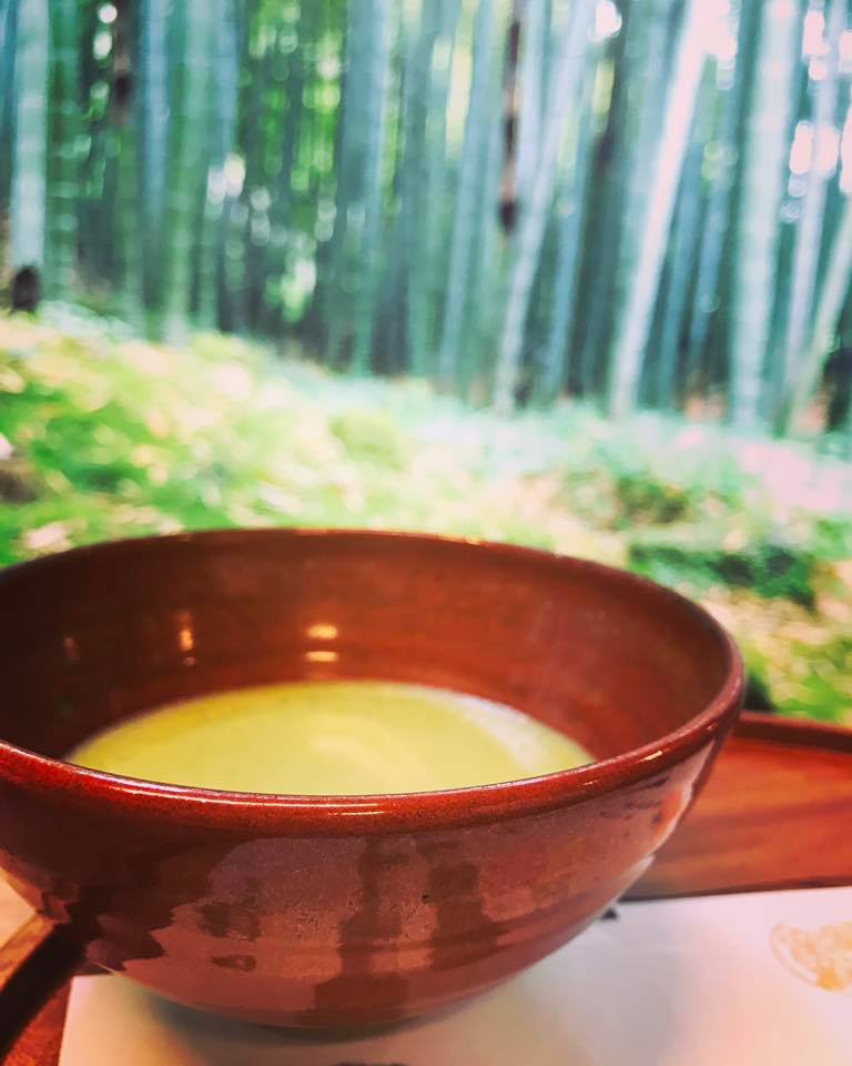 Once we made it through the bamboo forest, which wasn’t all that large (probably a good thing, since we’d likely have gotten lost), there was a little hut at the back of the area, near a cliff’s edge, where they were offering macha tea. You will have been given the option when entering the area that you could pay extra for this. We thought it’d be a neat experience, so we’d paid the extra 2 or 3 dollars and were able to relax while drinking some amazing macha tea, facing the bamboo stalks.