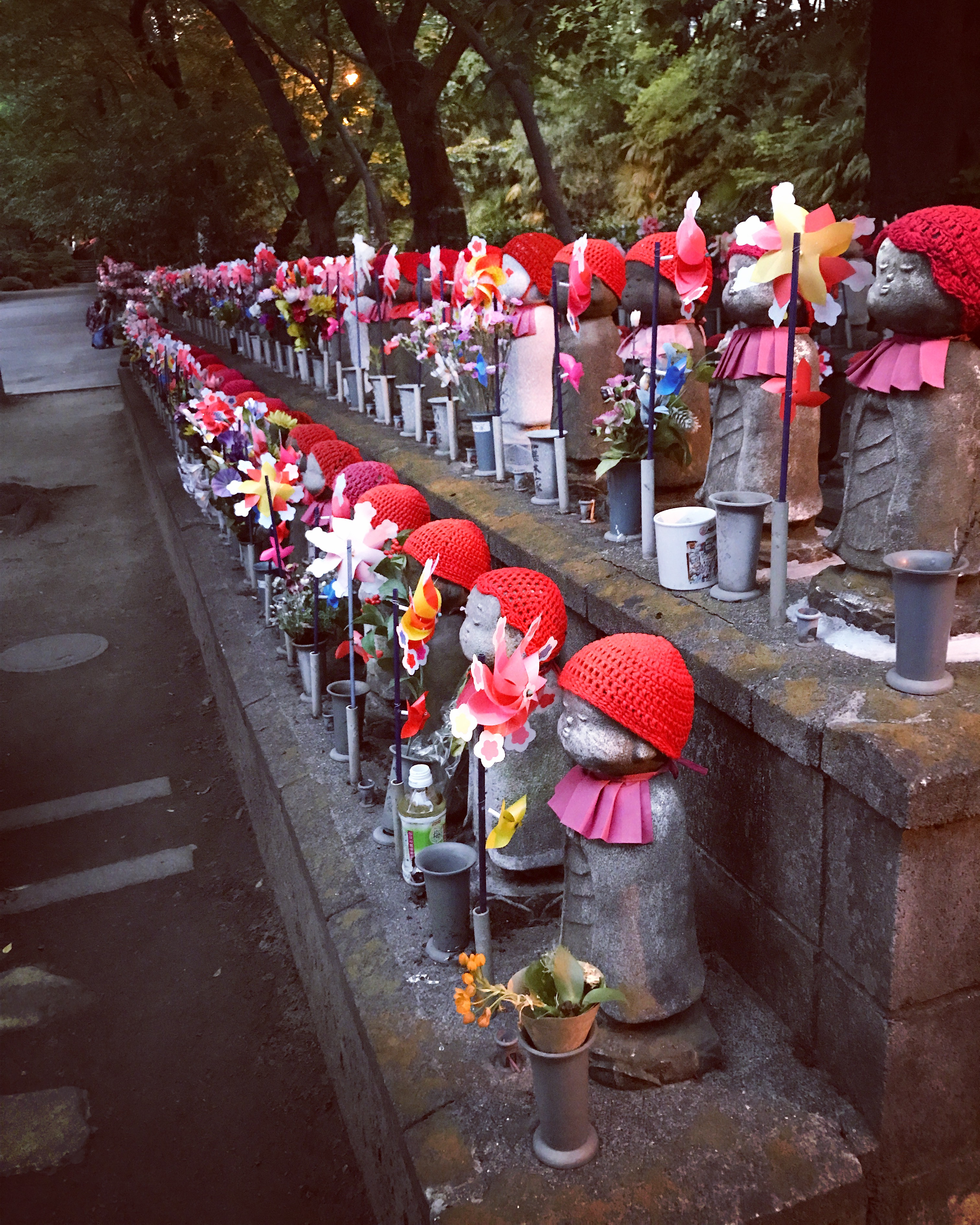 I’m very glad that we decided to do this though, since we accidentally found ourselves walking through Tokyo’s Chinatown, which was neat, and then also stumbling upon a temple we had no idea about, between Chinatown and Tokyo Tower (which I now know to be the Tokyo Zojo-ji Temple). Since it was getting dark, it was also interesting for us to see what temples look like closer to night time, and it also had a portion of the property devoted to Jizo-statues (something I had somehow not seen yet while in Japan). For those of you who don’t know, these statues all start out shaped, and looking the same, but are then claimed by mothers who have lost a child, or children, one way or another. These statues have a long and complex history (which you can read more about here and here), and are mainly meant to cope with the loss of a child. Seeing them was kind of a dream of mine, but was also a heartbreaking experience.