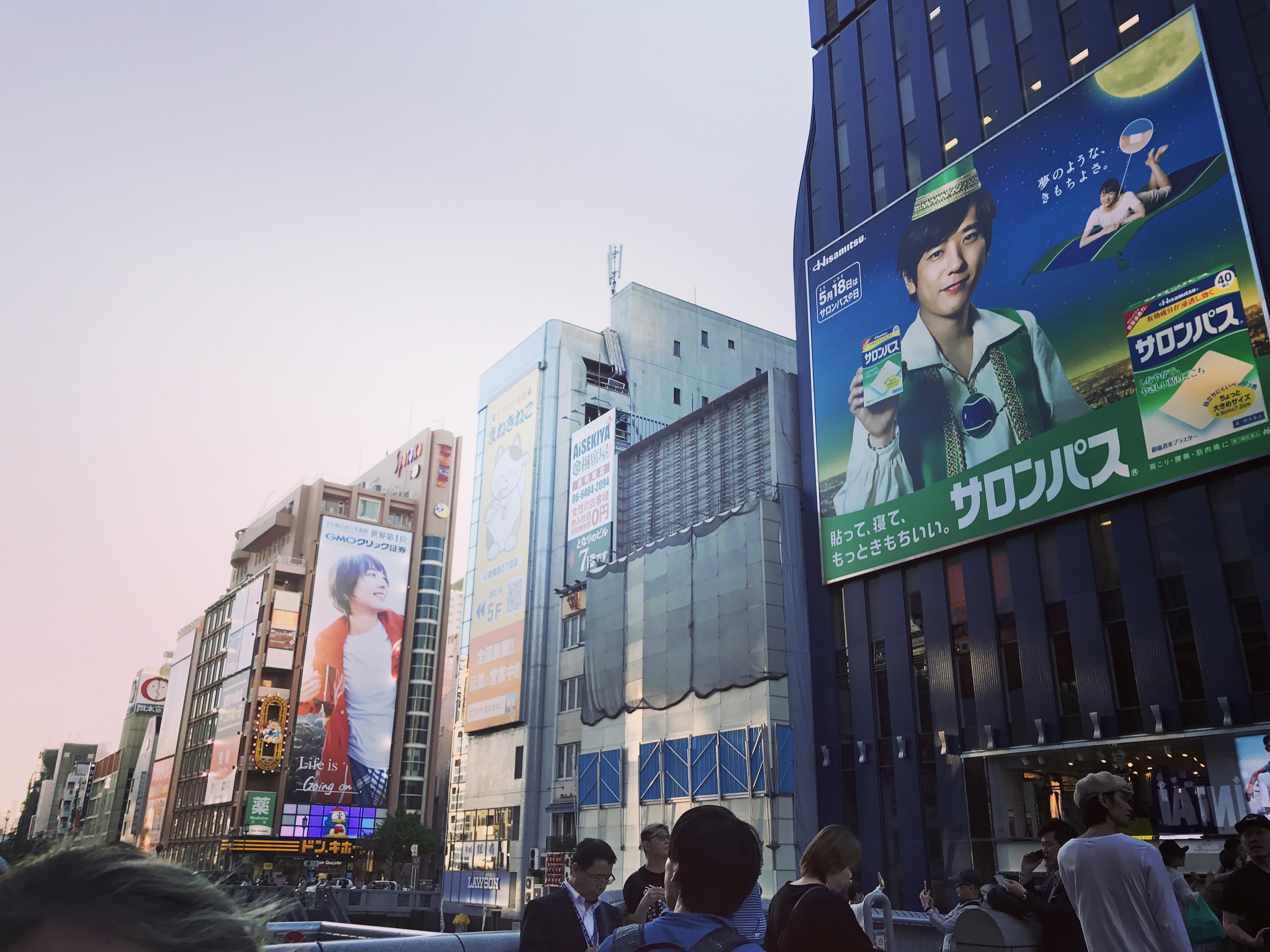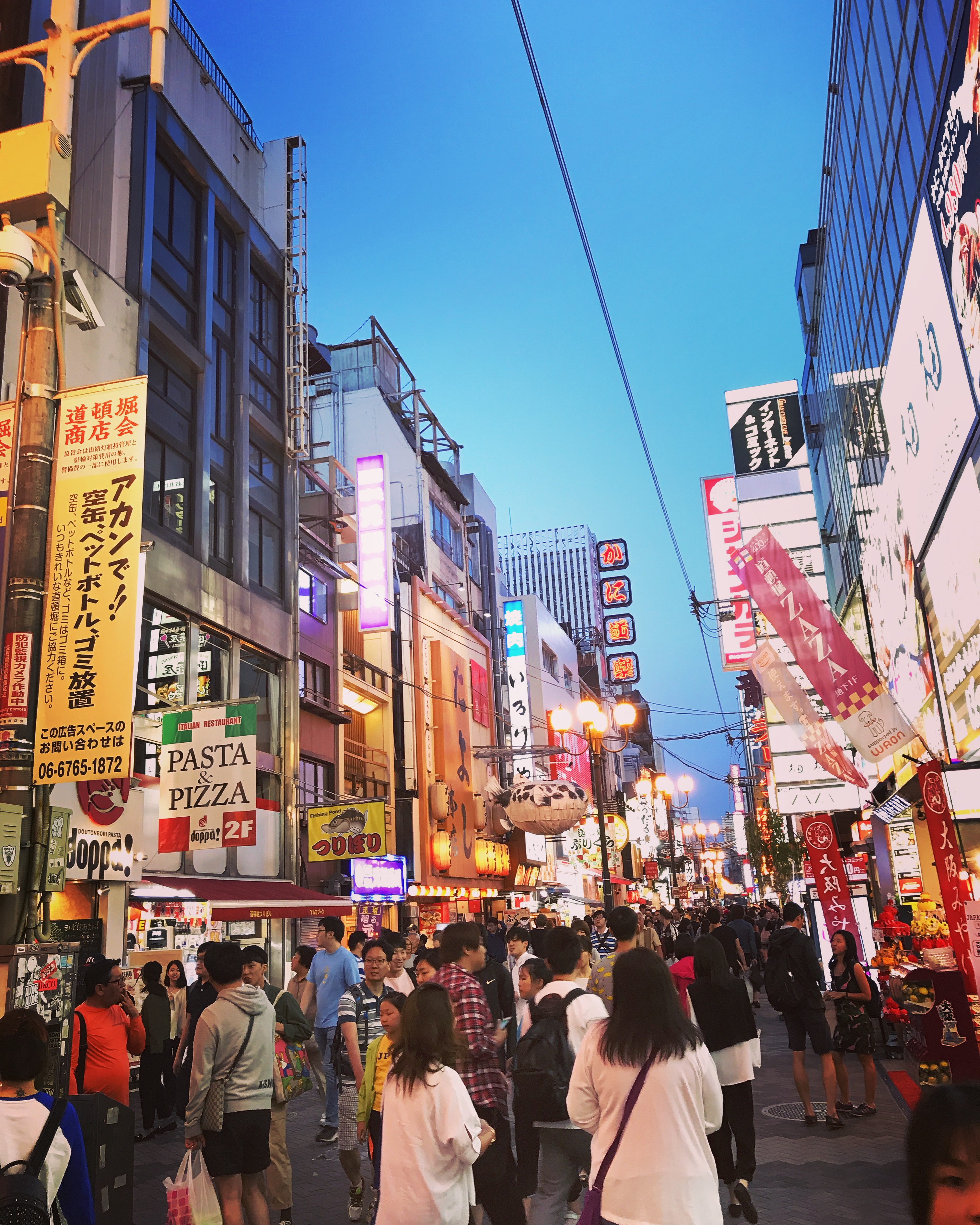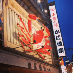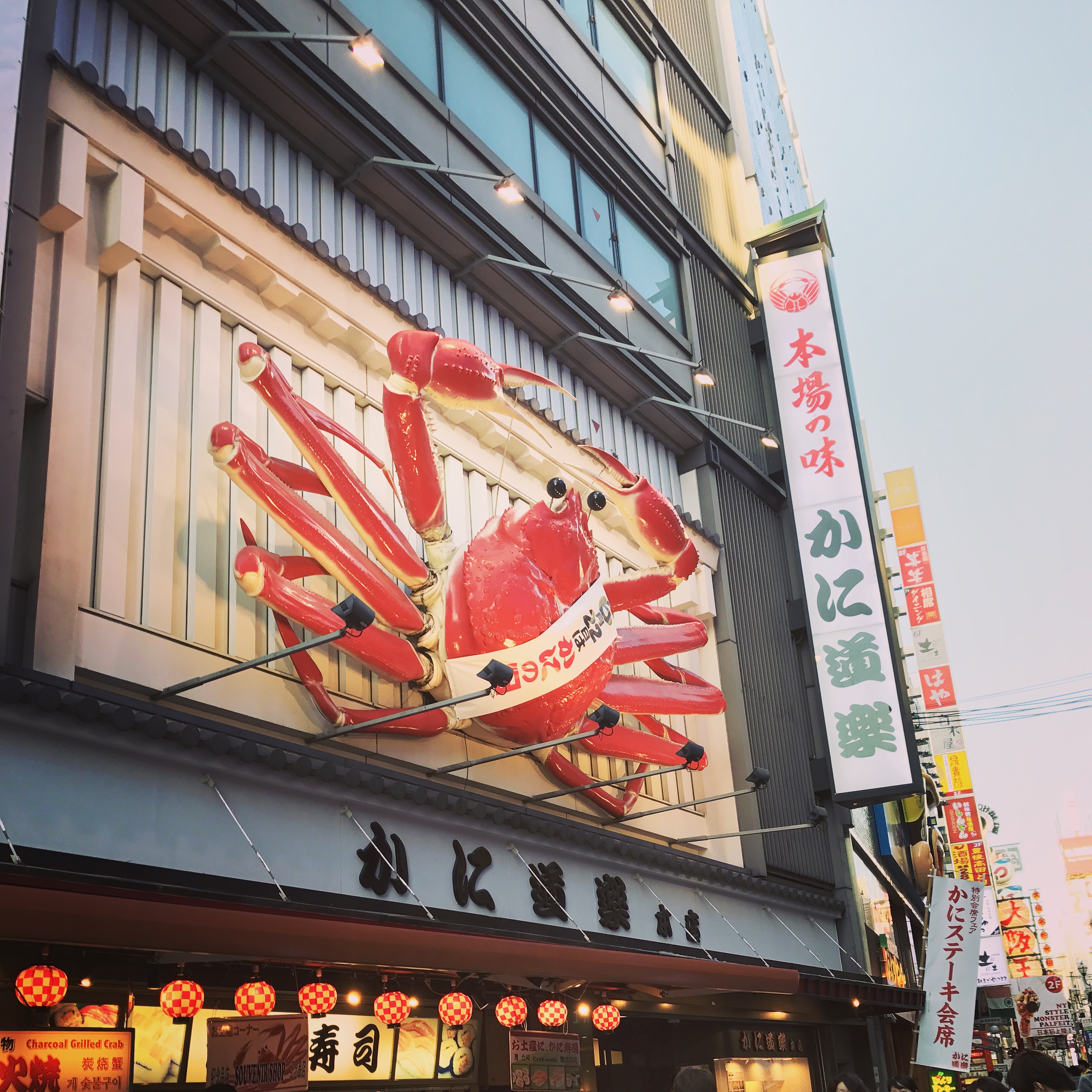 Once we had enjoyed some cold drinks from one of those handy dandy vending machines, we made our way into the downtown area! And I have to say…downtown Osaka definitely feels different from Tokyo, or any other city that I’ve been to. The atmosphere and appearance of it is very unique, and we had to go see the famous crab of Osaka (which is a moving robotic crab that decorates the entrance to the restaurant Kanidoraku honten Osaka)!