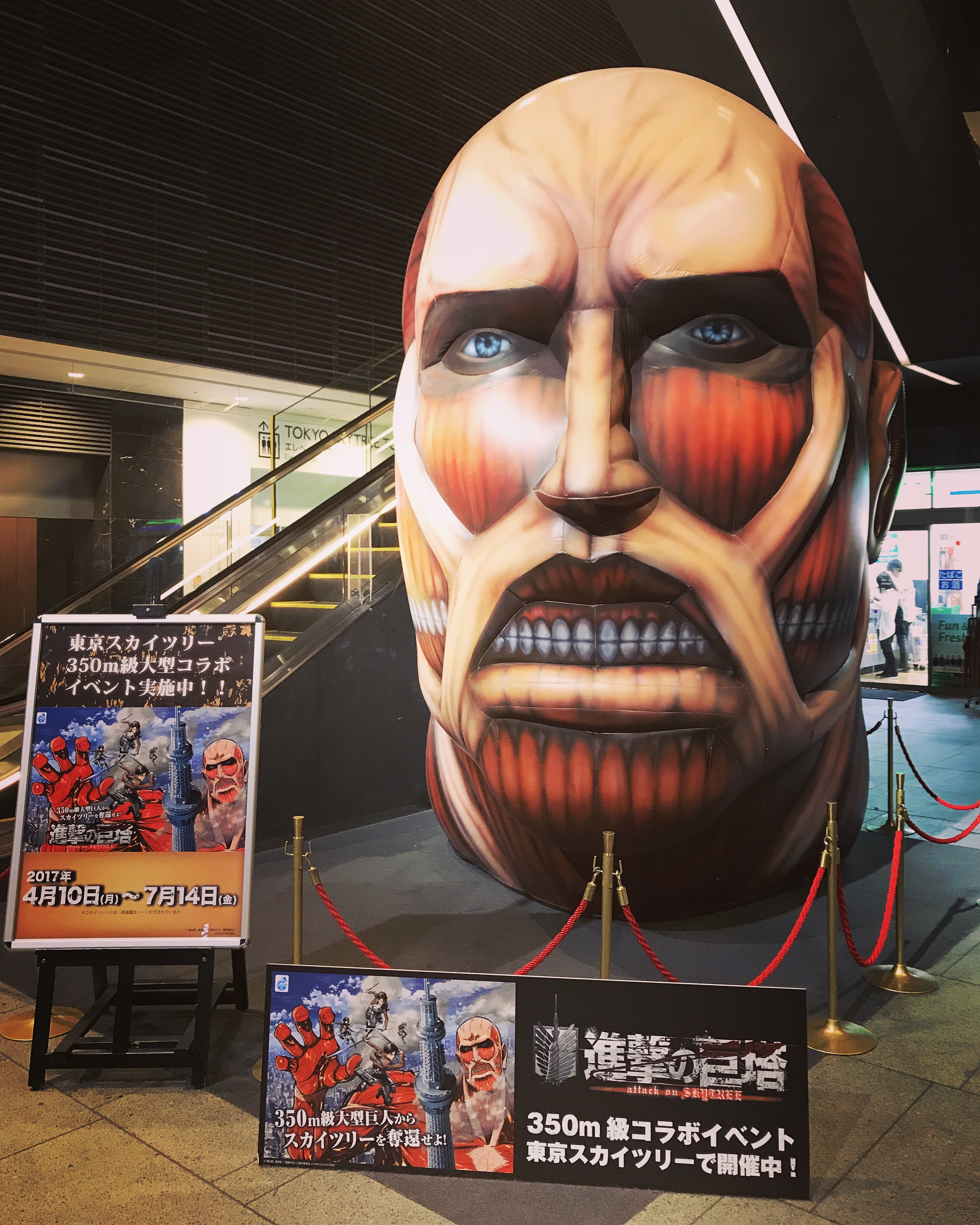 Sadly, we didn’t think to check if it was closed on any days of the week … and we managed to decide to visit the palace on exactly the day that it’s closed every week! Sigh. So, we wandered around the perimeter, which was very green and pretty as well, and then made our way to the Tokyo Skytree (which is now the tallest building in Tokyo! Sorry Tokyo Tower!) We took a look at it from below, and visited some of the shops at its base (where we found a large display thing about Attack on Titan, which my dad and I are fans of). There was also a Studio Ghibli store which we spent way too much time in, but we didn’t go up to the top of Skytree because it was just too expensive!