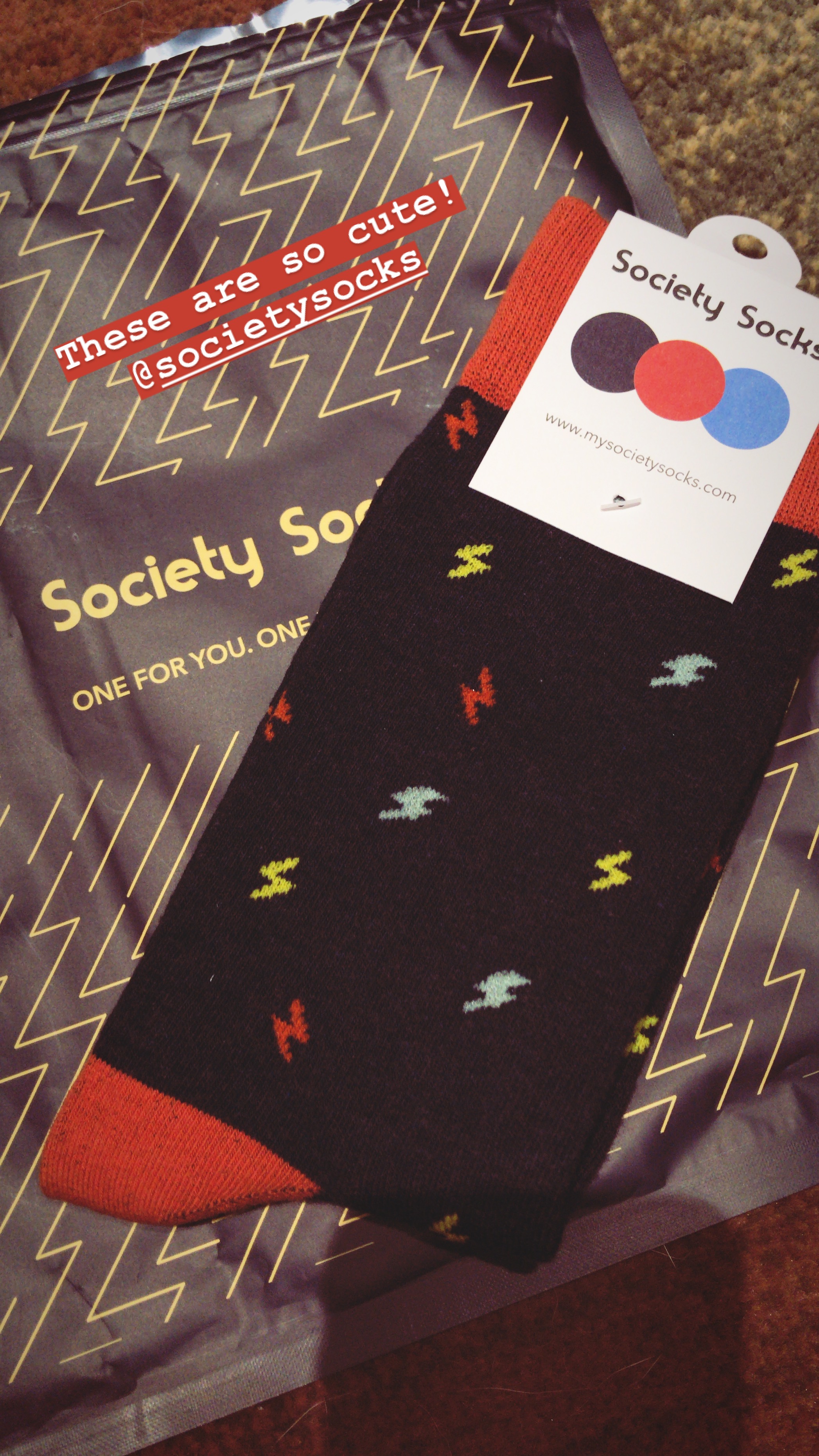I’m so excited to have received a pack of Society Socks to review for you guys! The company gives you the choice of signing up for a monthly subscription (which includes 2 pairs of men’s socks a month) or buying pairs of socks just on their own too. They have such cute designs! Oh my goodness. But anyway. As you can see below, I got a yellow pair with puppies on them, and a navy pair with lightning bolts on them.